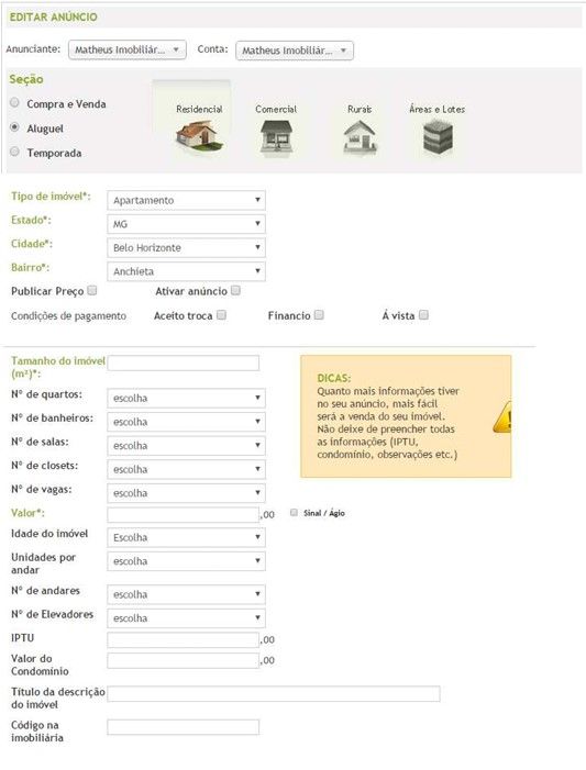 Através desta opção, é possível criar um anúncio que será publicado no lugarcerto.com.br. É