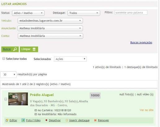 Esta opção lista todos os anúncios da Imobiliária. Para que os anúncios da carteira sejam