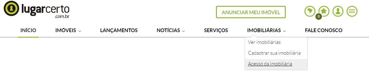 2 - Acessando a nossa página principal http://www.lugarcerto.com.br, indo no menu "Imobiliárias", e depois no Sub-Menu "Acesso da Imobiliária" como pode verificar através da imagem abaixo: