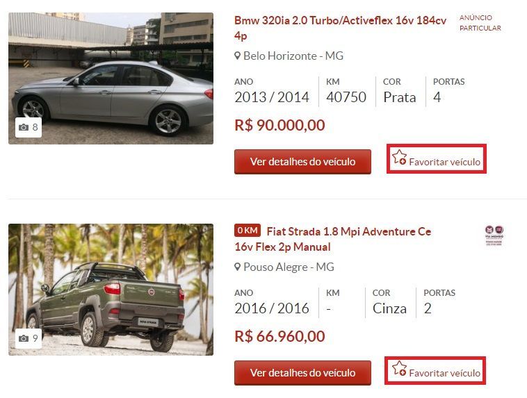Para que você possa marcar os veículos como favoritos é simples. Basta realizar um busca pelo veículo desejado em nosso site, e na página seguinte onde é mostrado o resultado da busca realizada, ao visualizar o imóvel do seu interesse, clique na opção disponível em todos os anúncios como no exemplo mostrado abaixo: