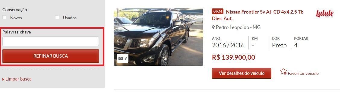 No caso de estar procurando um veículo específico ou tenha um código de veículo fornecido por um lojista que anuncia seus veículos no Vrum, você também pode realizar a busca por "palavra-chave" e assim localizar rapidamente o veículo que procura. A opção de realizar a busca por "palavra chave" está disponível no final da busca refinada ;) .