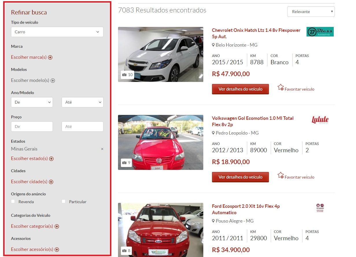 Para refinar a busca pelo seu veículo, primeiro realize uma busca simples em nossa página principal e clique em "Pesquisar Veículos". Na página seguinte que chamamos de resultado de busca, você poderá refinar a sua busca.