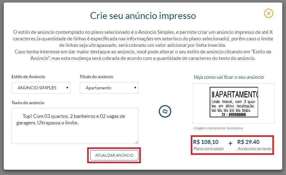 A dica para o valor se manter fiel ao plano contratado, é que após digitar o texto do anúncio do jornal, que você clique em "Atualizar anúncio" para ver se o valor aumentará. Você pode alterar o texto e clicar em