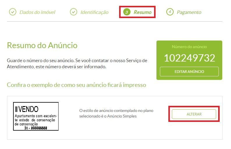Após digitar o texto desejado e atualizar o valor do anúncio, basta clicar "X" no para que você retorne até a etapa "Resumo", e assim possa finalizar o seu anúncio.