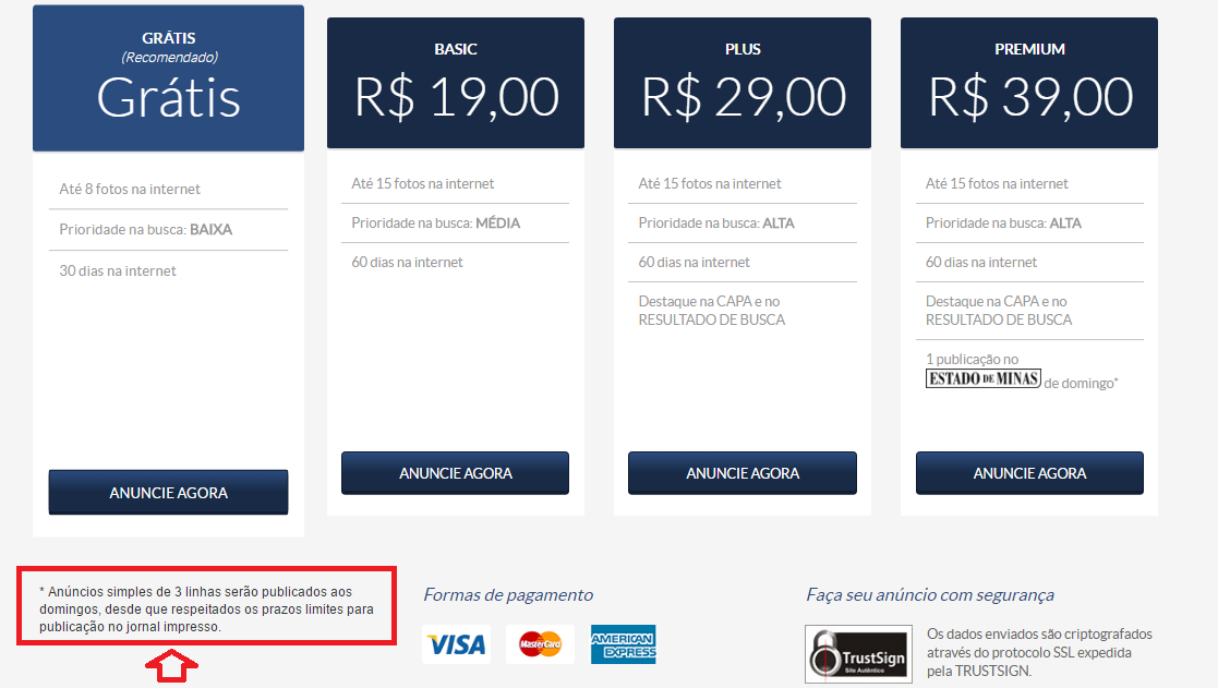 - Logo ao realizar o anúncio no Portal Classificados EM, na tela de planos, é informado abaixo dos planos o limite de linhas que o anúncio deverá possuir para aquele plano (exemplo abaixo). Caso ao criar o texto do anúncio do jornal esse limite de linhas seja ultrapassado, será cobrado um valor adicional por linha inserida.